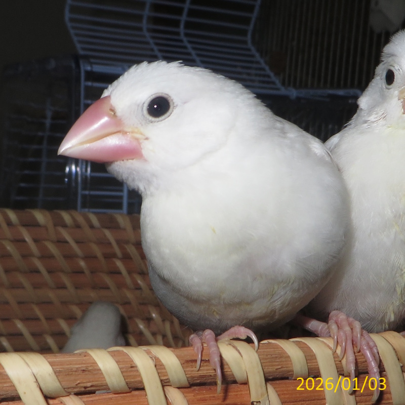 白文鳥の手乗りヒナ「ちゅー」【孵化30日目〜】 自家繁殖(11/24孵化・自家繁殖 両親白桜【マダラ&ジュン】) 税込価格